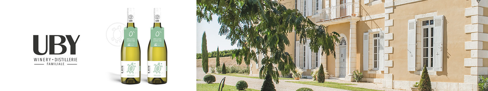Le domaine UBY propose deux vins sans alcools, un "zéro alcool bio rosé" et un "zéro alcool bio blanc" : deux boissons fermentées désalcoolisées à base de raisins bio.